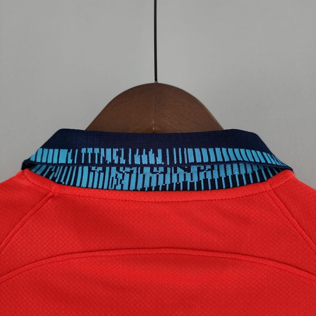 A camisa da Inglaterra II para a temporada 2022/2023 é uma polo vermelha, exibindo o icônico brasão da equipe no peito esquerdo. Com um design clássico e elegante, esta camisa é uma representação vibrante do orgulho e da tradição do futebol inglês.