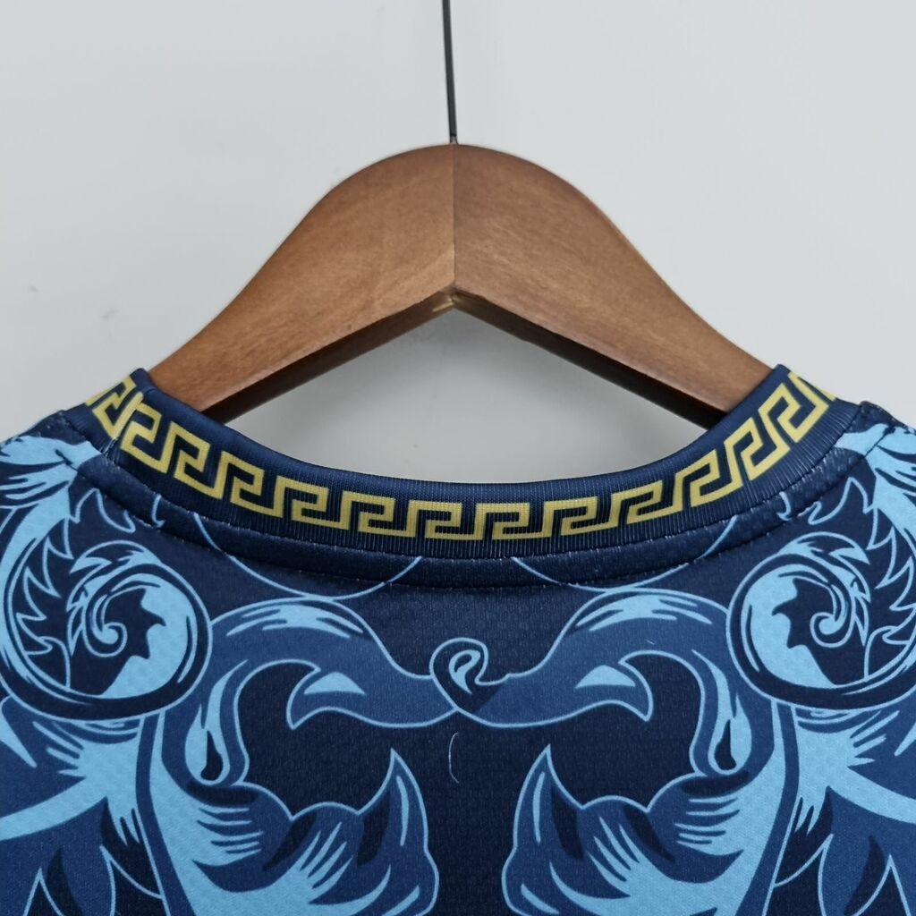 Em uma colaboração exclusiva entre a moda italiana e o futebol, a edição especial da camisa da Itália para a temporada 22/23 traz o glamour e a sofisticação da marca Versace para o campo. Em um tributo à elegância atemporal, esta camisa apresenta detalhes luxuosos inspirados no icônico estilo da Versace, com padrões distintos e acabamentos refinados em toda a peça. O emblema da FIGC é elevado a um novo patamar de estilo e classe. Esta camisa não é apenas um uniforme, é uma declaração de moda e orgulho nacional, unindo o melhor da tradição italiana à inovação contemporânea