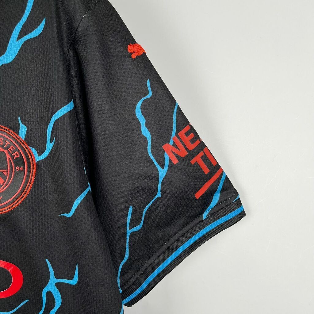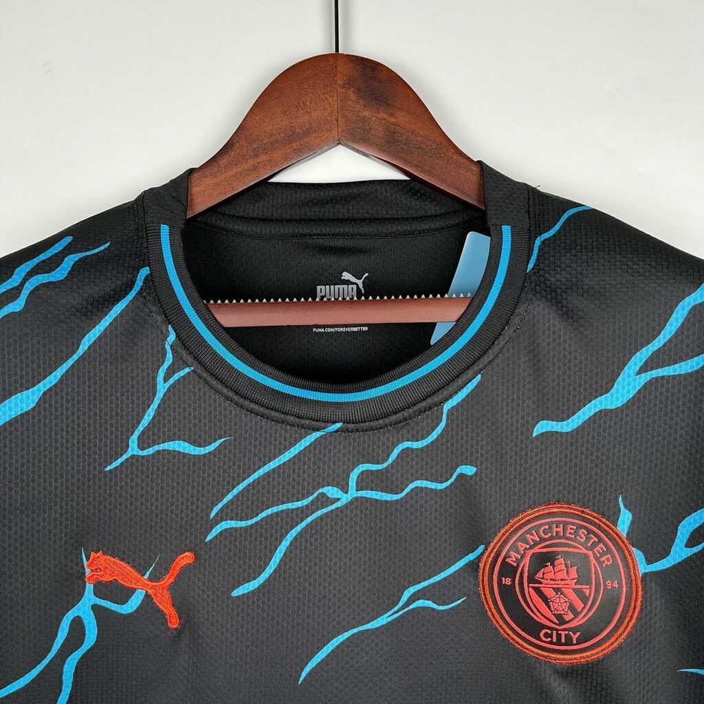 A terceira camisa do Manchester City para a temporada 23/24 é uma explosão de energia e estilo. Inspirada no jogo ultra-rápido e na atmosfera vibrante do clube, apresenta um padrão de faísca elétrica em todo o tecido, destacada também por detalhes em rosa. O escudo do clube e os logotipos dos patrocinadores também incorporam essa energia. Esta camisa não apenas reflete a intensidade dos jogos do City, mas a celebra, permitindo que os torcedores vivam a emoção do futebol de uma maneira completamente nova.