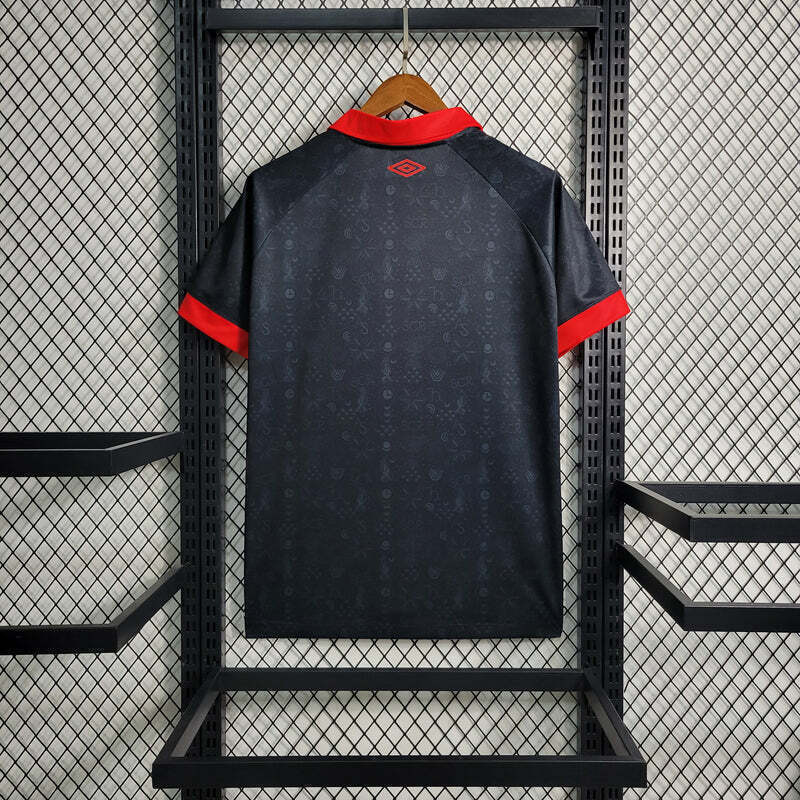 A camisa Sport Ariano Suassuna é uma peça de destaque, com uma listra vertical vermelha no centro sobre um fundo preto elegante. Repleta de detalhes que homenageiam a rica cultura nordestina, como bordados e elementos simbólicos, esta camisa polo combina estilo e tradição. É mais do que uma simples peça de vestuário esportivo; é uma expressão do legado literário e cultural deixado por Ariano Suassuna, representando o orgulho e a paixão pelo esporte e pela região nordestina.